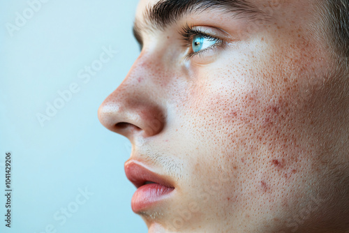 Closeup man face with red pimples, inflammation on face and problem skin. Acne, rosacea and couperose therapy. Facial treatment skincare routine and hygiene Cosmetic and beauty banner with copy space