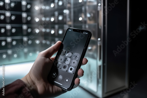 Close-up mock up hand holding smartphone with empty screen in bank vault background . Generative ai