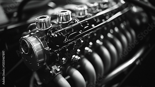 Close-up monochrome shot of a classic car engine's intricate details, showcasing its polished components and mechanical complexity.