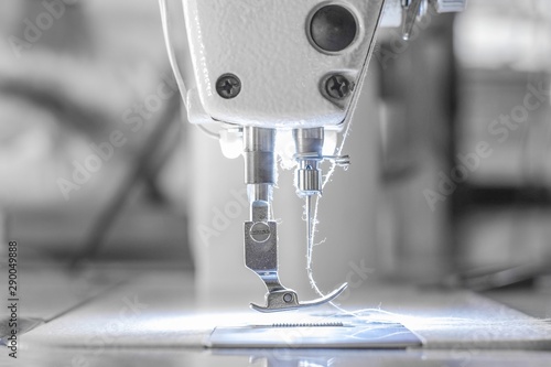 Close-up needle of white industrial sewing machine with blurred background and bokeh.