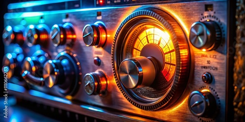 Close-up Night Photography of a Tuning Dial on a Shortwave Ham Radio with Glowing Indicators and Rich Textures in a Dark Setting