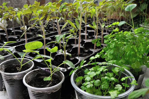 close-up of seedlings of the various vegetables in the greenhouse ready for planting in the vegetable garden