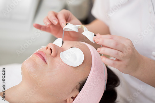 Close-up of a beautician take off protective glasses from a girl's eyes after a cosmetic procedure. Process of radio wave lifting in the spa salon