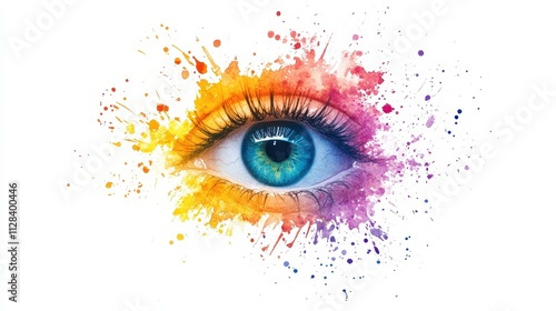 Close-up of a Beautiful Blue Eye Surrounded by Colorful Watercolor Splashes in Orange, Yellow, Pink, and Purple Against a White Background