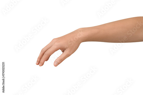 Close-up of a beautiful hand gesturing to pick up or hold a small, invisible object. Isolated on a transparent PNG.