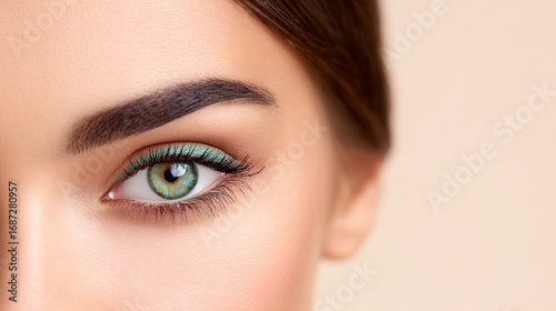 Close-up of a beautiful womans eye with striking green iris, perfectly shaped eyebrows, and subtle makeup, showcasing natural beauty and captivating gaze