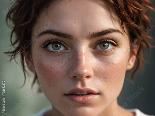 Closeup of a beautiful young woman's face, blue eyes, few dark spots on her face,