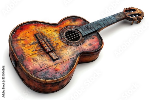 Close-up of a beautifully crafted, rustic wooden guitar with vibrant colors, evoking a sense of timeless music and artistry.