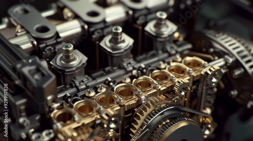 Close-up of a beautifully detailed engine component, showcasing intricate metallic parts with a golden hue, highlighting precision engineering.