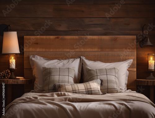 Close-up of a bed in a rustic bedroom made of rough wood