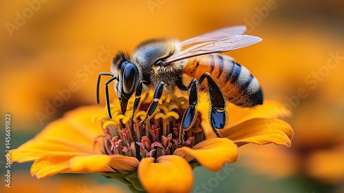 Closeup Of A Bee On A Yellow Flower With A Blurred Orange Background and Soft Light Photography. Golden Hour Wildlife Photography. Detailed Macro Photography Of Insects and Flowers. Outdoor