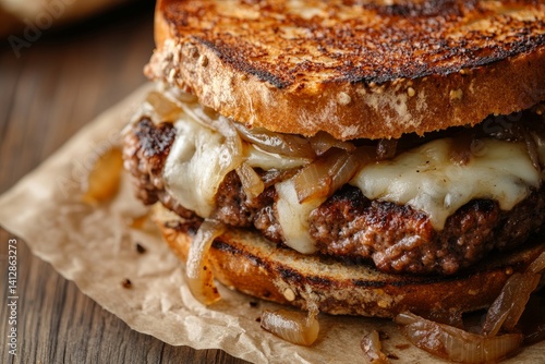Close-up of a beef patty melt with caramelized onions and melted cheese on rye bread clean and professional composition, copy space, natural color, minimalism, stock photography