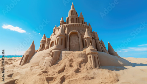 Close-up of a big sand castle on the beach with a blue sky in the background.