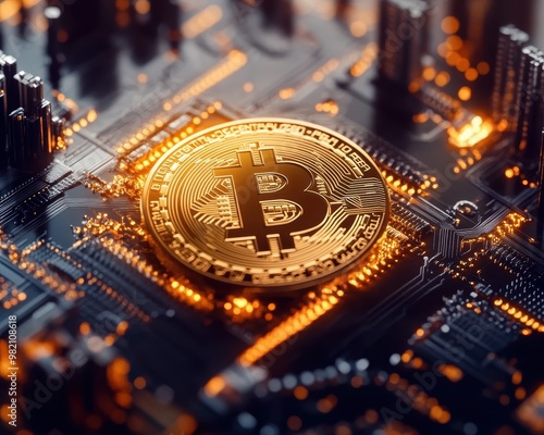 Close-up of a Bitcoin on a circuit board, symbolizing digital currency and technology innovation in the cryptocurrency industry.