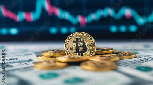 Close-up of a Bitcoin on top of dollar bills with a digital chart in the background, symbolizing cryptocurrency investment and financial growth.