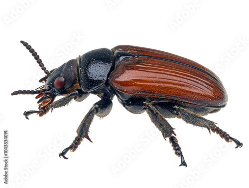 Close-up of a black and brown beetle with intricate details on a plain background.