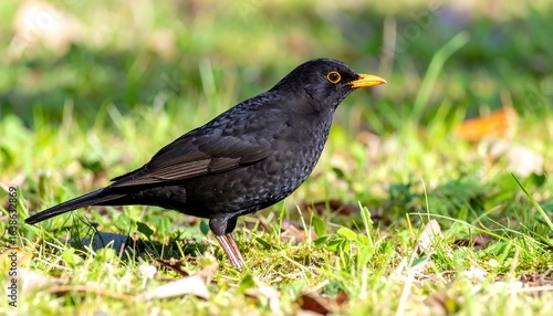 Close-up of a blackbird foraging in grass.