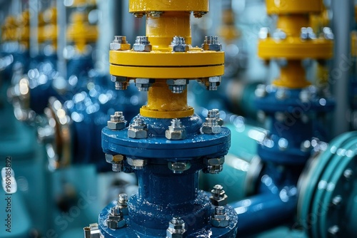 Close-up of a blue and yellow industrial pipe with multiple bolts