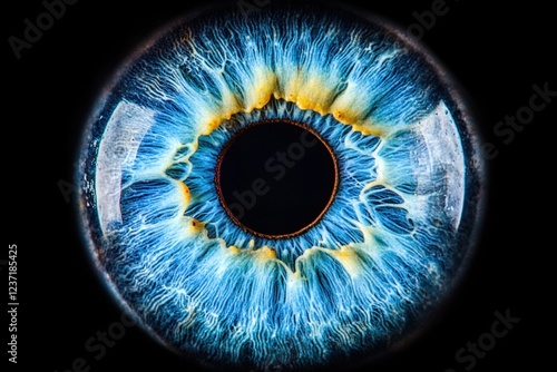 Close-up of a blue eye showcasing mesmerizing patterns and vibrant colors, revealing the complexity and beauty of human anatomy