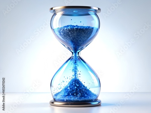 Closeup of a blue hourglass on white background, symbolizing the passage of time, deadlines, and the urgency of business matters isolated on white background
