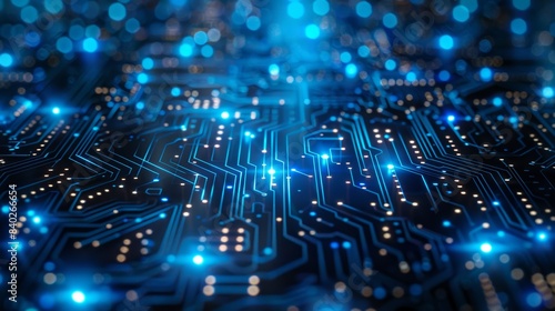 Close-up of a blue illuminated electronic circuit board, symbolizing technology, innovation, and the digital revolution.