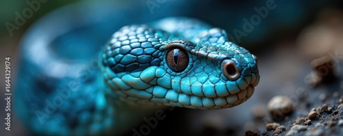 Close-up of a blue insularis pit viper, showing scales and fangs , tropical, detail, exotic