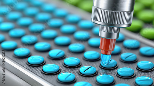 Close-up of a blue pill being inserted into a white pill on a cosmetic production line in a high-quality environment