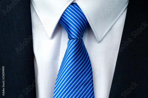 Close-up of a blue striped tie with withe shirt and dark businessman suit.