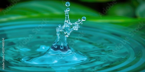 Close-up of a blue water splash on a leafy green background with ripples and movement, calm, blue