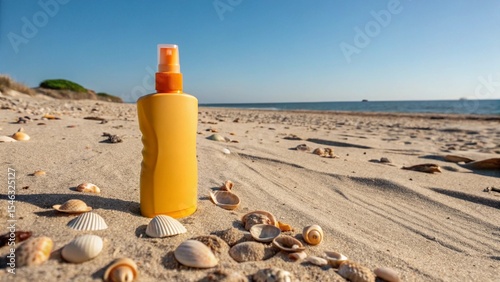 Close-up of a bottle of sunscreen on a sandy beach with seashells and a clear blue sky in the background