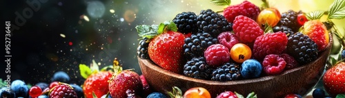 Close-up of a bowl filled with fresh, ripe berries: strawberries, raspberries, blackberries, blueberries and yellow berries.