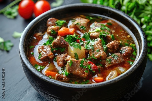 Close-up of a bowl of beef stew. This image is perfect for illustrating a recipe for beef stew or for representing hearty and comforting food.