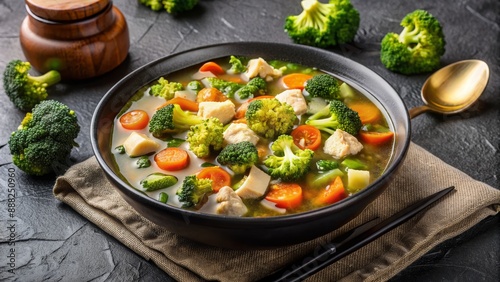 Close-up of a bowl of broccoli and chicken soup with a spoon and chopsticks on a rustic table, broccoli, chicken, soup, healthy