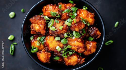 Close-up of a bowl of crispy fried chicken pieces covered in a sticky glaze, garnished with chopped green onions, on a dark textured background.