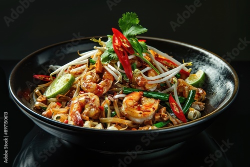 Close-up of a Bowl of Pad Thai with Shrimp, Bean Sprouts, and Cilantro
