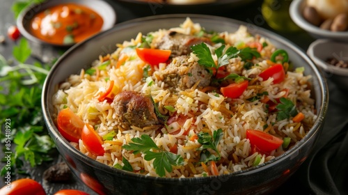 Close-up of a Bowl of Rice with Meat and Vegetables