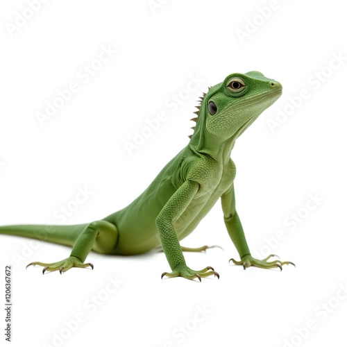 Closeup of a bright green lizard isolated on a white background.