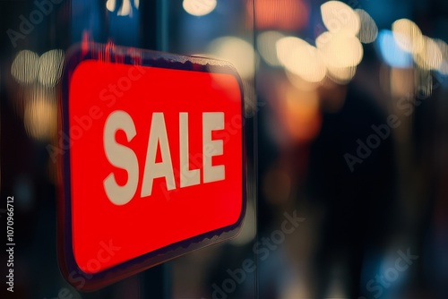 Close-up of a bright red "SALE" sticker on a store window, blurred figures of people passing by in the background.