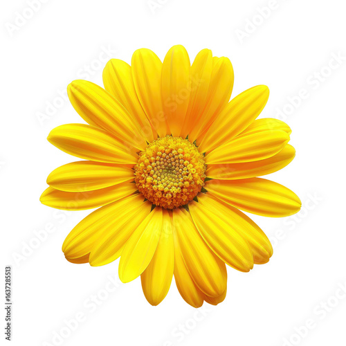 Close-up of a bright yellow flower, with a detailed center and outlined petals