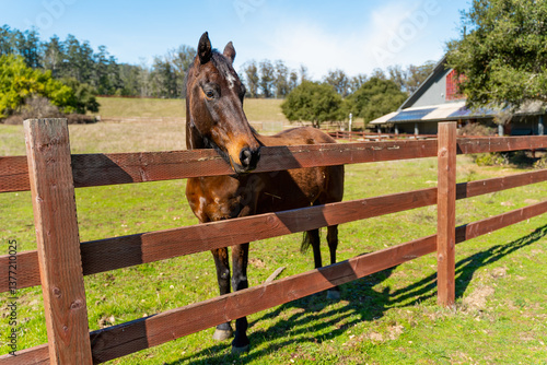 Close-up of a brown horse behind a fence on a farm image