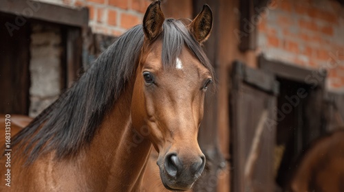 Close-up of a brown horse in a rustic stable, showcasing its calm demeanor and shiny coat during the afternoon hours