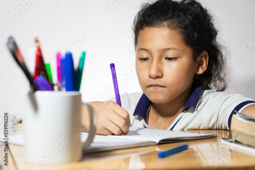 close-up of a brunette Latina girl, studying at her desk with a bored look on her face