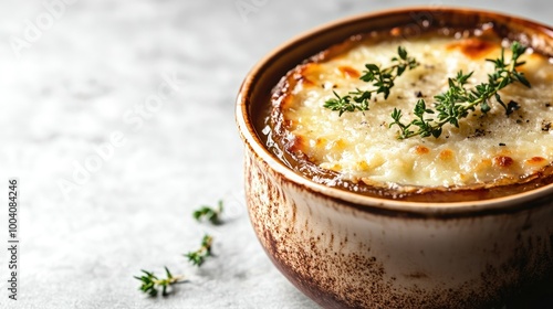 Closeup of a bubbling French onion soup in a ceramic bowl, garnished with herbs and cheese, set against a light background that allows for ample copy space.