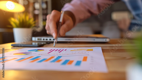 Close-up of a business leader's hand reviewing ESG data on a paper chart, with sustainable office decor in view