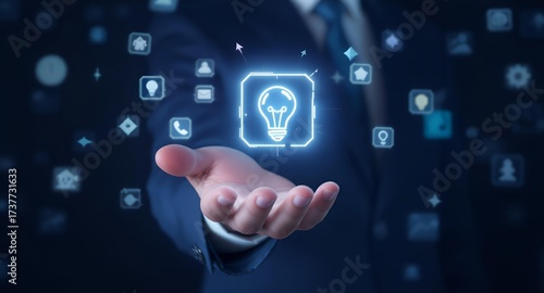 Close-up of a businessman presenting a glowing light bulb icon with various digital symbols floating around in a dark background with a futuristic and innovative mood.