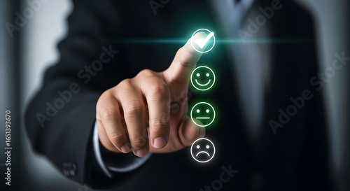 Closeup of a businessmans finger selecting a positive smiley face on a touch screen interface for customer satisfaction feedback