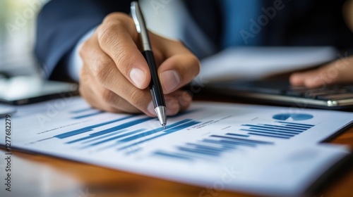 Close-up of a businessman's hand meticulously analyzing financial charts and graphs, showcasing a concentrated and detail-oriented approach to business strategy.