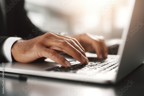 Close-up of a businessman's hands typing on a laptop computer in an office. The close-up view highlights the use of technology, with the concept of working from home or online.