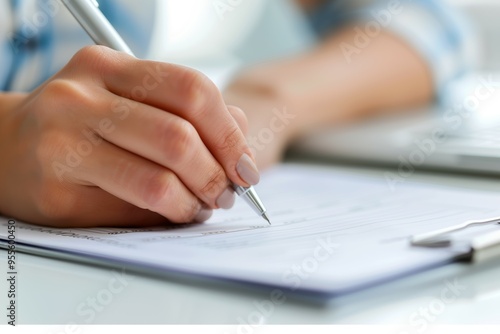 Close-up of a businesswoman's hand writing on a document with a pen in a professional setting, emphasizing focus, precision, and attention to detail in paperwork and administrative tasks