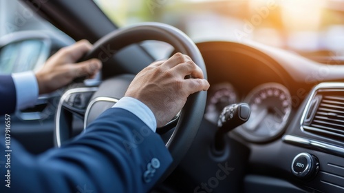 Close-up of a car salesman's hand demonstrating features in a modern car interior during a sales presentation